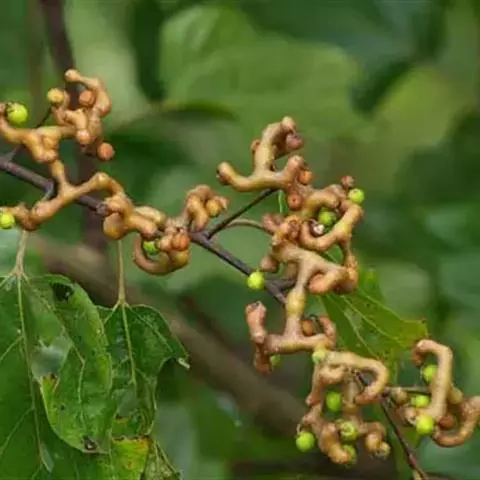 枳椇(学名:Hovenia acerba Lindl.)鼠李科枳椇属高大乔木,高10-25米,小枝褐色或黑紫色,叶互生,厚纸质至纸质,宽卵形、椭圆状卵形或心形,叶柄长2-5厘米,二歧式聚伞圆锥花序,顶生和腋生,花两性,萼片具网状脉或纵条纹,花瓣椭圆状匙形,浆果状核果近球形,成熟时黄褐色或棕褐色,种子暗褐色或黑紫色,花期5-7月,果期8-10月。