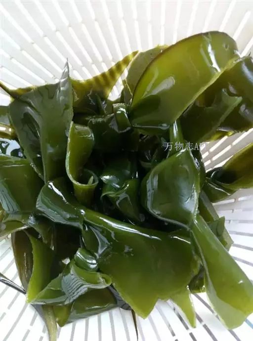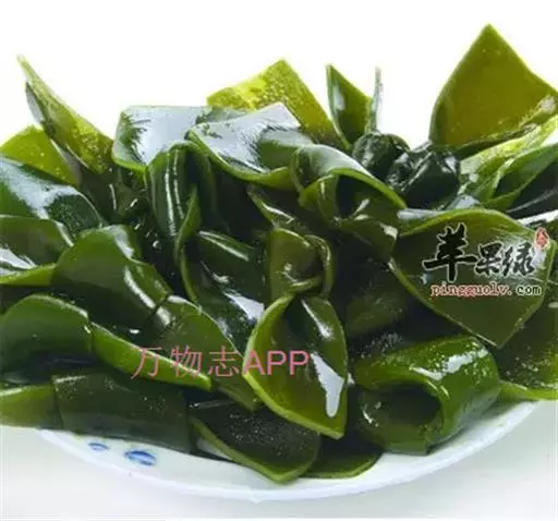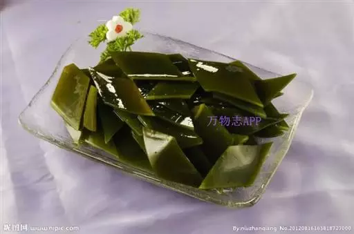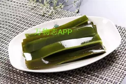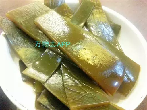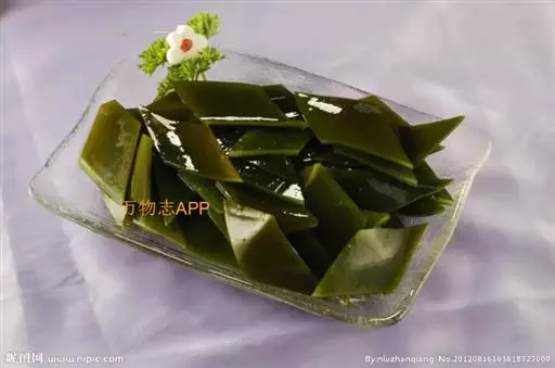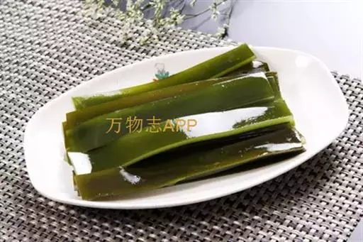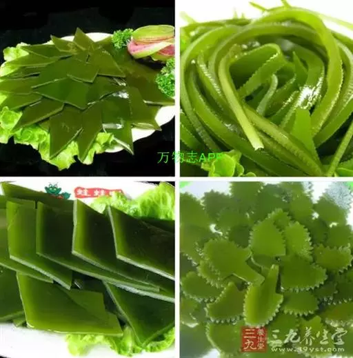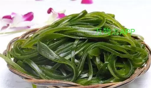【成分】鲜品可食用部分100%。每100g中含能量70kJ、水分94.4g,蛋白质1.2g,脂肪0.1g,膳食纤维0.5g,碳水化合物1.6g,硫胺素0.02mg、核黄素0.15mg,尼克酸1.3mg:维生素E 1.85mg;钾246mg,钠8.6mg,钙46mg,碘0.28mg,镁25mg、铁0.9mg,锰0. 07mg、锌0.16mg,磷22mg、硒9.54μg。维生素C未检出。尚含藻胶酸(高达32%)和昆布素等。