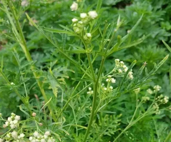 银胶菊(学名:Parthenium hysterophorus L.):一年生草本。茎直立,高0.6-1米,多分枝,具条纹,被短柔毛,节间长2.5-5厘米。下部和中部叶二回羽状深裂,全形卵形或椭圆形,小羽片卵状或长圆状,常具齿;上部叶无柄,羽裂,裂片线状长圆形,全缘或具齿,中裂片较大,通常长于侧裂片的3倍。头状花序多数,径3-4毫米,在茎枝顶端排成开展的伞房花序。舌状花1层,5个,白色,长约1.3毫米,舌片卵形或卵圆形,顶端2裂。管状花多数。雌花瘦果倒卵形,基部渐尖,干时黑色,顶端截平或有时具细齿。花期4-10月。