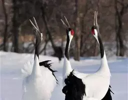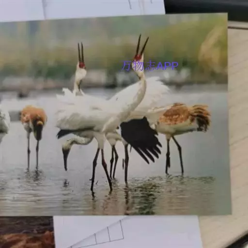 白鹤(学名:Grus leucogeranus):是大型涉禽,略小于丹顶鹤,体长130-140厘米。站立时通体白色,胸和前额鲜红色,嘴和脚暗红色;飞翔时,翅尖黑色,其余羽毛白色。虹膜棕黄色,嘴、脚暗红色。2龄脚变红色,3龄嘴亦变为红色。