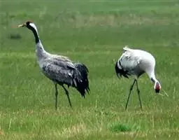 蓑羽鹤大型涉禽,体长68~92厘米,是鹤类中个体最小者。通体蓝灰色,眼先、头侧、喉和前颈黑色,…