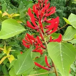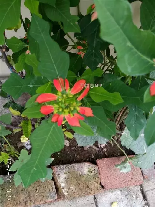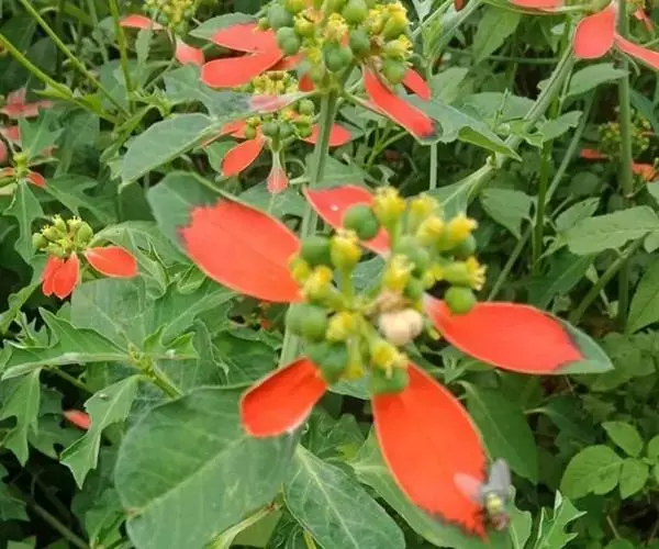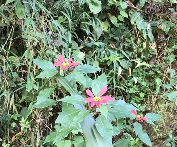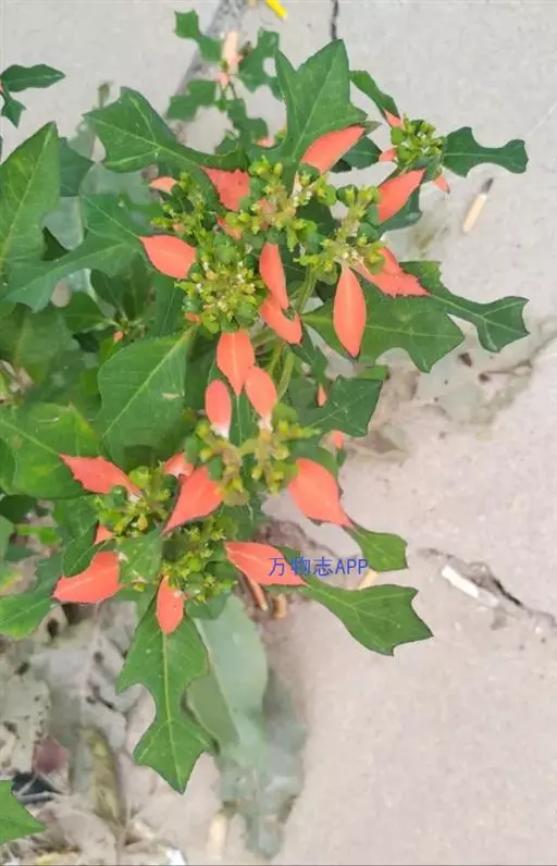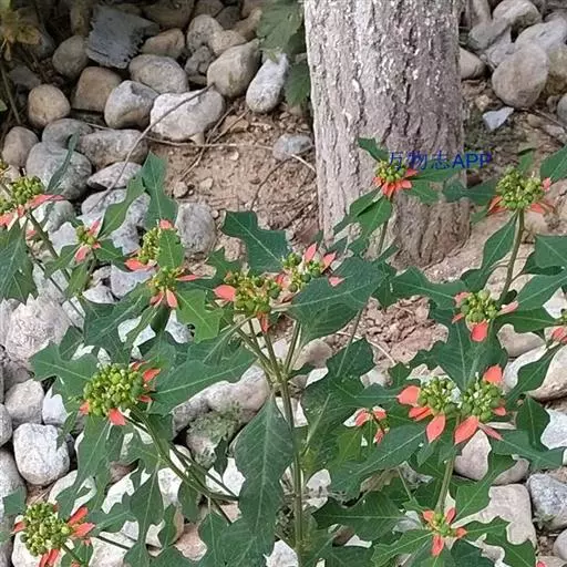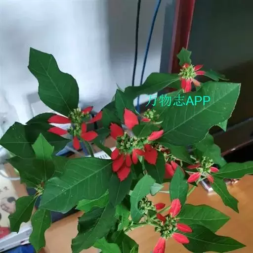 猩猩草(学名:Euphorbia cyathophora Murr.):常绿或半常绿灌木,盆栽时株高0.5米-2米,在亚热带地区可长到6米以上。茎直立而光滑,单叶互生,卵状椭圆形至阔披针形,具不规则的深缺刻。长10-15厘米。花小,有蜜腺,排列成密集的伞房花序。总苞形似叶片,也叫顶叶,基部大红色,也有半边红色半边绿色的。上面簇生出红色的苞片,向四周放射而出,苞片和叶片相似,只是较狭,是主要观赏部位。雌雄同株异花,雌花单生于花序的中央,雄花多数,均无花被。蒴果扁圆形。种子卵圆形,黑色。