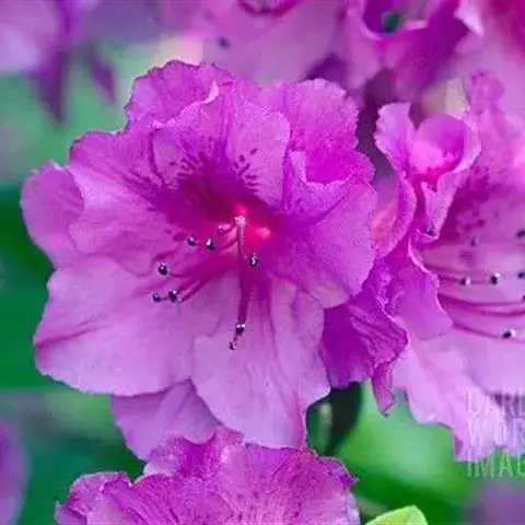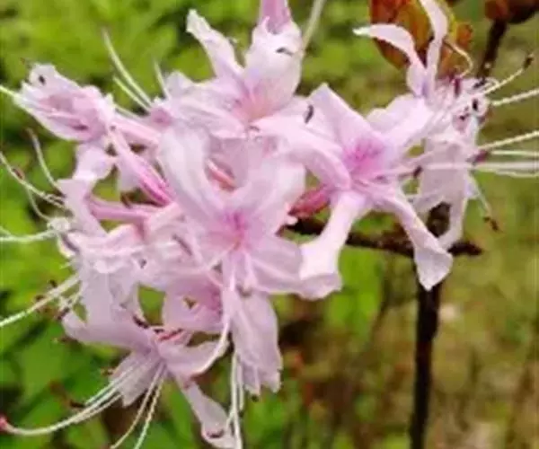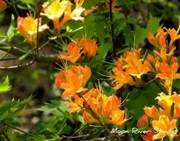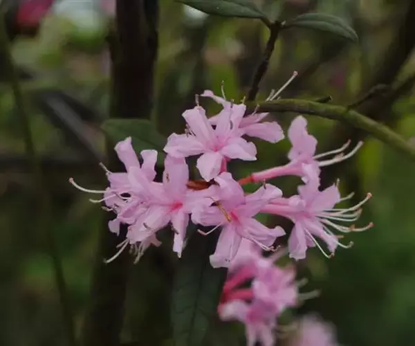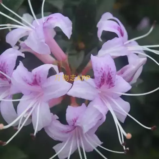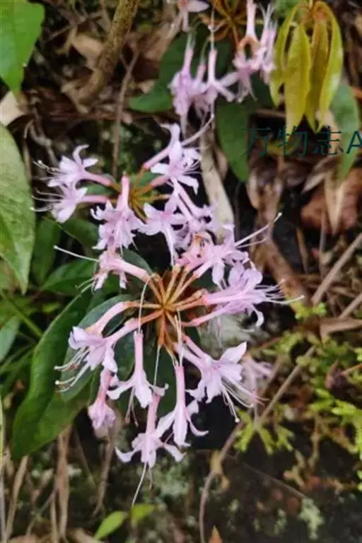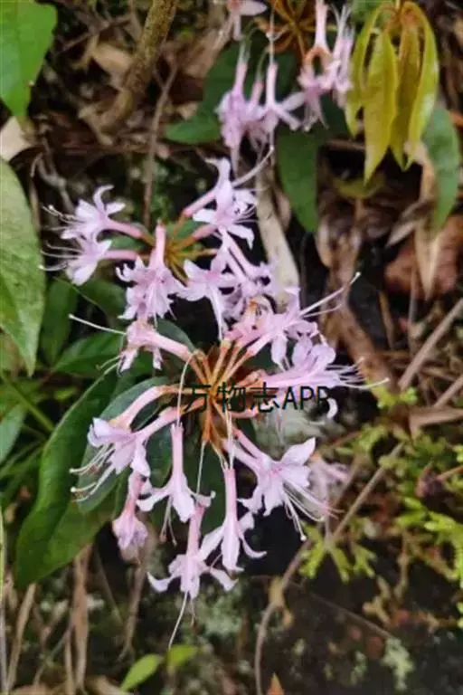 溪畔杜鹃(学名:Rhododendron rivulare Hand.-Mazz.):常绿灌木,高可达3米;幼枝纤细,叶纸质,上面深绿色,下面淡黄褐色,叶脉在上面凹陷,下面凸出,花芽圆锥状卵形,伞形花序顶生,有花多达10朵以上;花梗密被短腺头毛及扁平长糙伏毛;花萼裂片狭三角形,被淡黄褐色短腺头毛及长糙伏毛;花冠漏斗形,紫红色,狭圆筒形,花丝基部被微柔毛,花药紫色,密被红棕色刚毛。蒴果长卵球形,4-6月开花,7-11月结果。