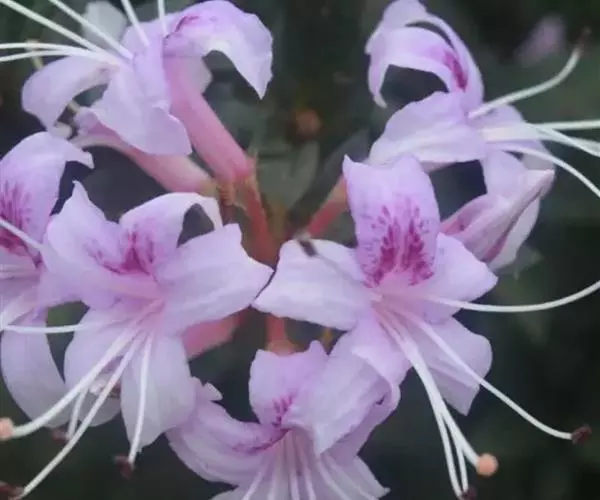 伞形花序顶生,有花多达10朵以上,花梗长1.5厘米,密被短腺头毛及扁平长糙伏毛;花萼裂片狭三角形,长2-5毫米,被淡黄褐色短腺头毛及长糙伏毛;花冠漏斗形,紫红色,长2.3厘米,花冠管狭圆筒形,长1.3厘米,向基部渐窄,径2毫米,外面无毛,内面被微柔毛,上部扩大,裂片5,长圆状卵形;雄蕊5,不等长,长2.5-2.8厘米,伸出于花冠外,花丝基部被微柔毛,花药紫色,长圆形,长3毫米;子房卵球形,褐色,密被红棕色刚毛。