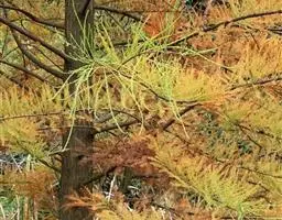 落羽杉 Rich.),杉科落羽杉属木本植物。树干尖削度大,基部通常膨大,具膝状呼吸根,树皮棕色,…