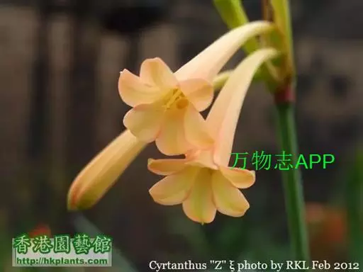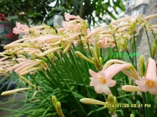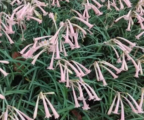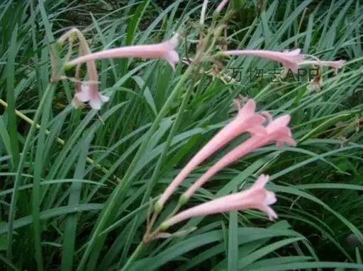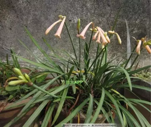 多年生常绿球根植物,株高约20~30cm,地下鳞茎球形。叶线形,绿色。花自地下鳞茎抽生而出,细长,花呈长筒状,略低垂,每个花枝着花8朵左右,有黄、橙红、白、粉红等色。