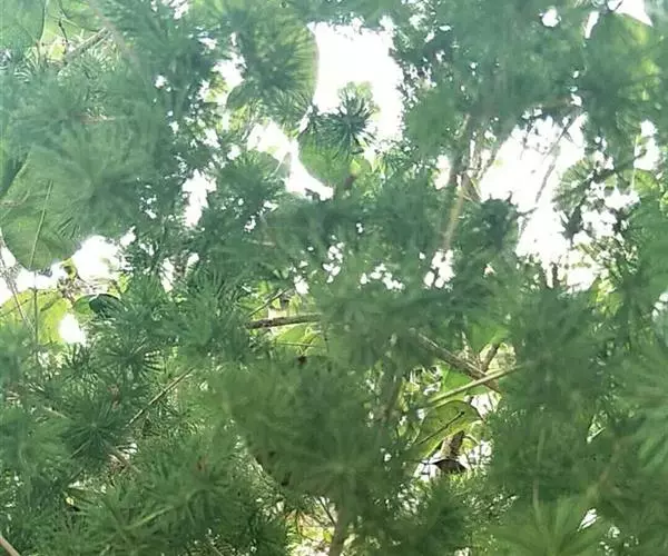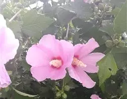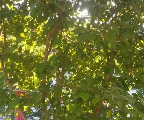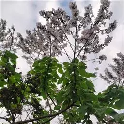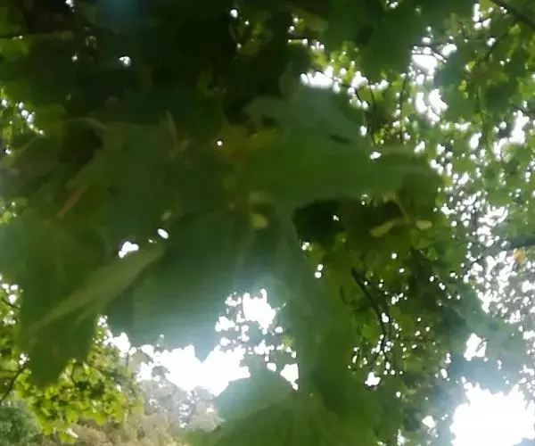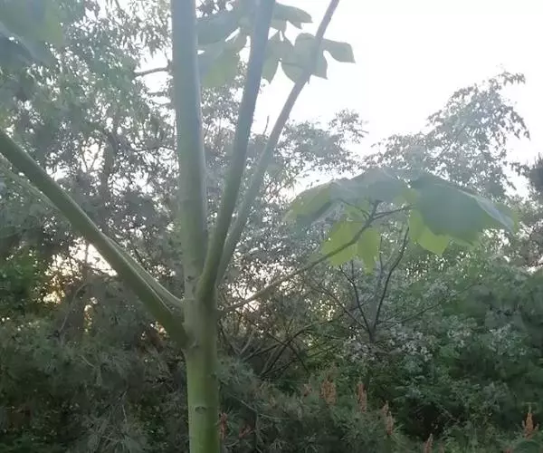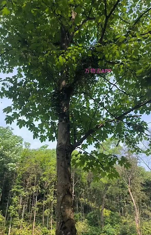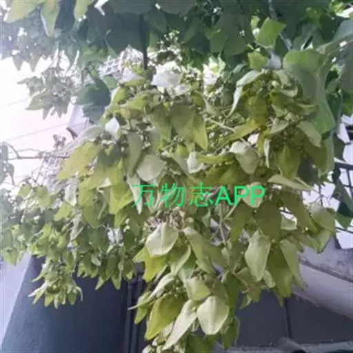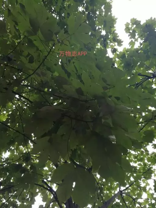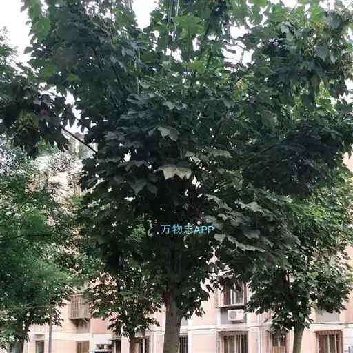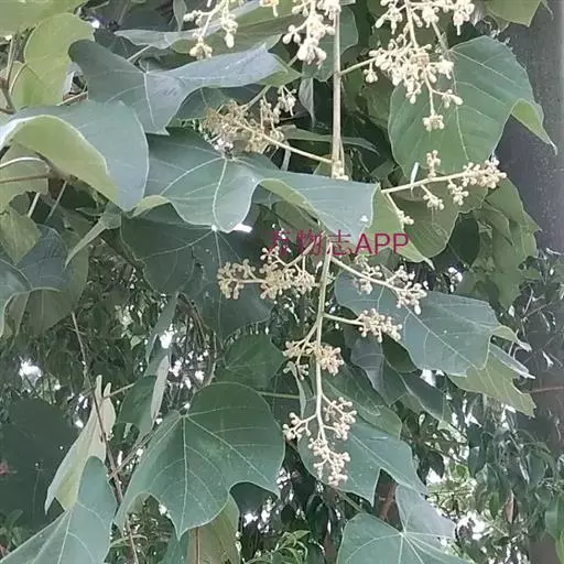 梧桐树是落叶乔木,高达15米;树叶青绿色,平滑。叶呈心形,掌状3~5裂,直径15~30厘米,裂片是三角 梧桐树(图2) 形,顶端渐尖,基部心形,两面均无毛或略披短柔毛,基生脉7条,叶柄与叶片等长。圆锥花序顶生,长约20~50厘米,下部分枝长达14厘米,花淡紫色;萼5深裂几至基部,萼片条形,向外卷曲,长7~9毫米,外面披淡黄色短柔毛,内面仅在基部披柔毛;花梗与花几等长;雄花的雌雄蕊柄与萼等长,下半部较粗,无毛,花药15个不规则地聚集在雌雄蕊柄顶端,退化子房梨形且甚小;雌花的子房圆球形,被毛覆盖。蓇葖果膜质,有柄,成熟前开裂成叶状,长6~11厘米、宽1.5~2.5厘米,外面短茸毛或几无毛,每蓇葖果有种子2~4个;种子圆球形,表面有皱纹,直径约6~7毫米。花期6月左右。