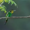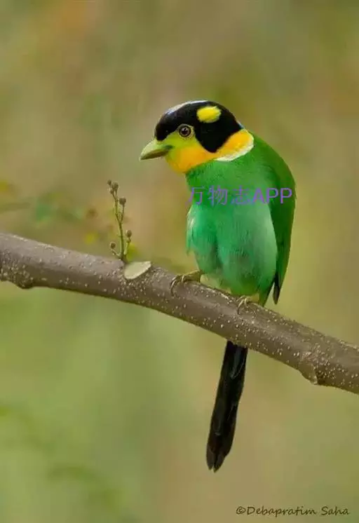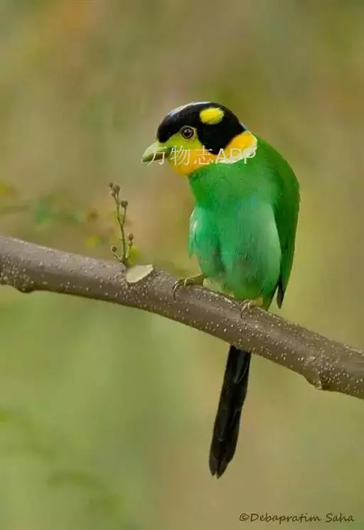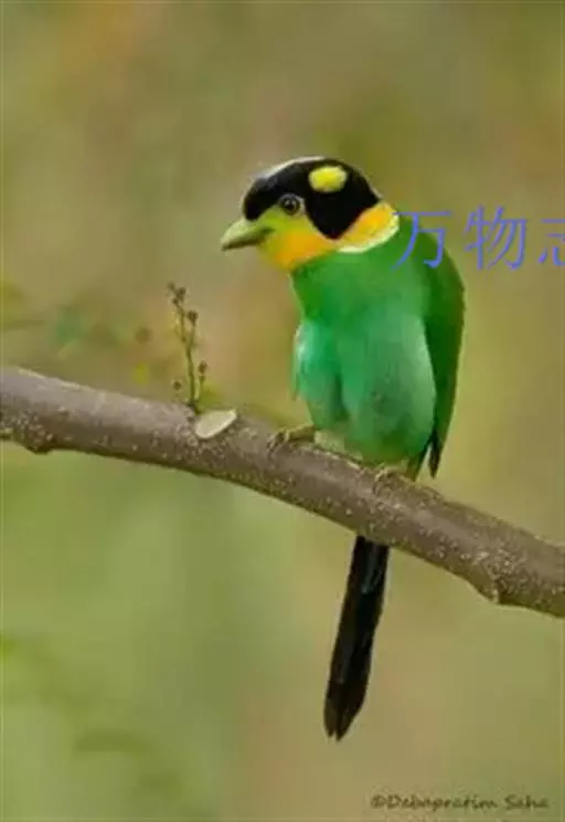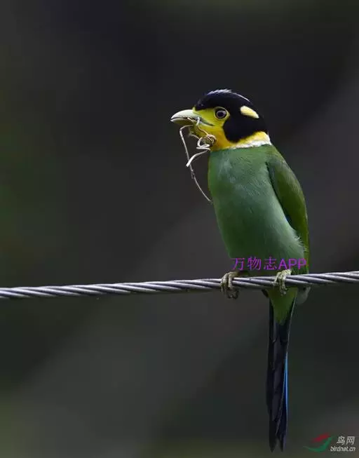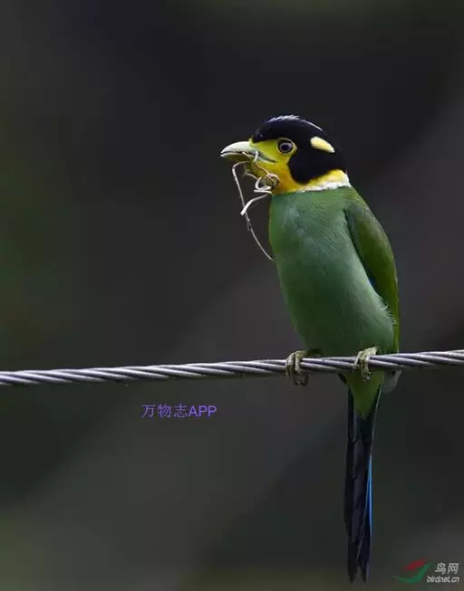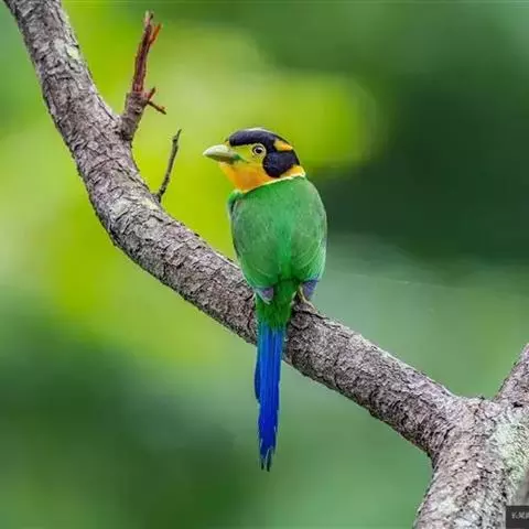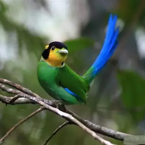 长尾阔嘴鸟是雀形目阔嘴鸟科的鸟类,体长约25厘米,是绿色阔嘴鸟。形长的楔形尾蓝色,喉及脸黄色,顶冠…