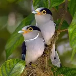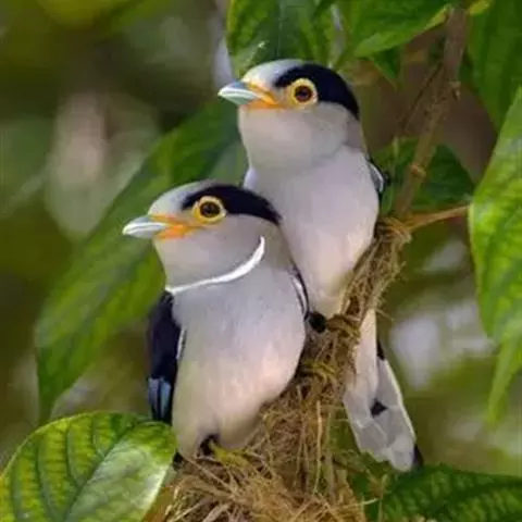 长尾阔嘴鸟(巢) 繁殖期长尾阔嘴鸟筑巢于海拔650米处的沟谷热带雨林中、溪流边的灌丛和矮树上。巢都是由山茅草、草根和藤蔓编织而成。巢形成梨状,系于枝条上,单个垂吊在水面,离水1.2-1.8米,每个巢之间约相距6-12米。巢长32厘米,底宽13厘米,口径6厘米。巢中有卵4-5枚。卵为壳白色,无斑点。