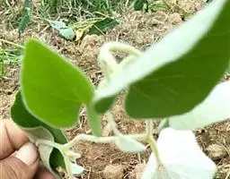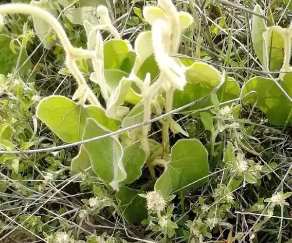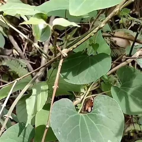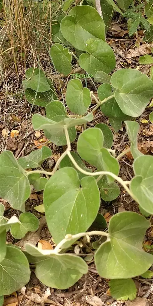 木质藤本;根细长,圆柱形;嫩枝密被灰白色长绵毛,老枝无毛,干后常有纵槽纹,暗褐色。叶纸质,卵形、卵状心形,长3.5-10厘米,宽2.5-8厘米,顶端钝圆至短尖,基部心形,基部两侧裂片广展,湾缺深1-2厘米,边全缘,上面被糙伏毛,下面密被灰色或白色长绵毛,基出脉5-7条,侧脉每边3-4条;叶柄长2-5厘米,密被白色长绵毛。
