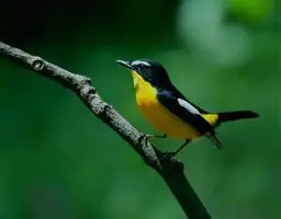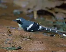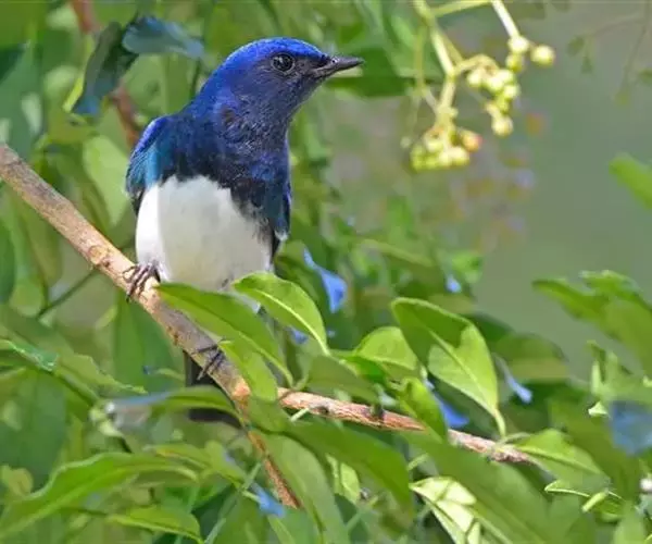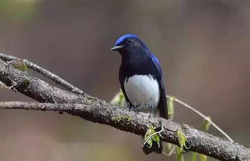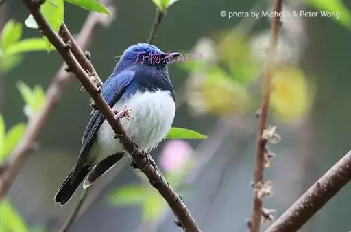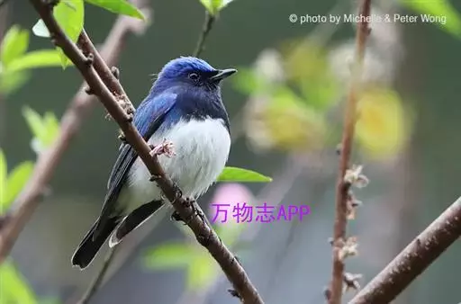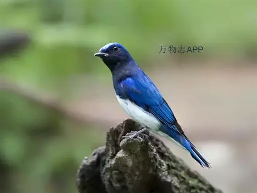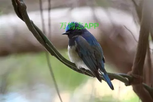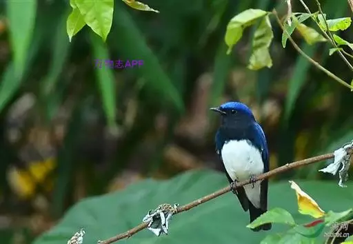 白腹蓝鹟(学名:Cyanoptila cyanomelana):体长14-17厘米,小型鸟类。雄鸟头顶钴蓝色或钴青蓝色,其余上体紫蓝色或青蓝色,两翅和尾黑褐色,羽缘颜色同背,外侧尾羽基部白色。头侧、颏、喉、胸黑色,其余下体白色。雌鸟上体橄榄褐色,腰沾锈色,眼圈白色。颏、喉污白色,胸灰褐色,胸以下白色。