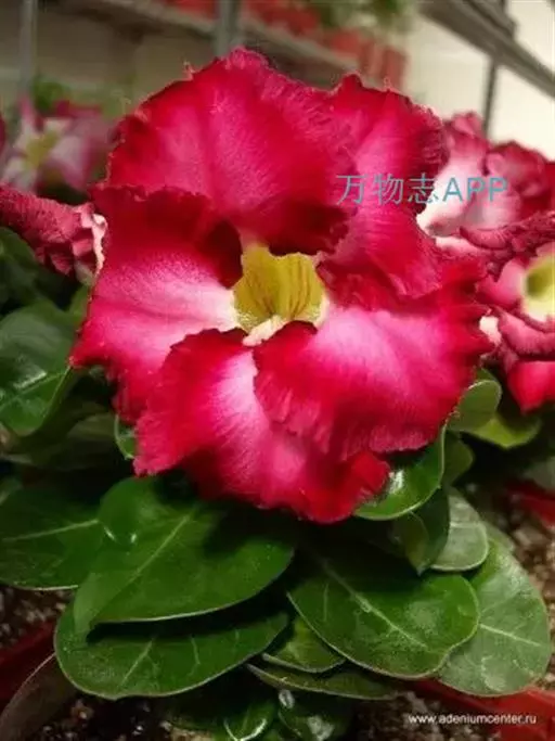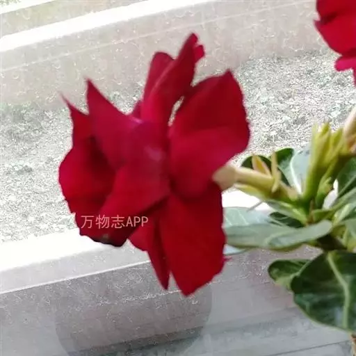 沙漠玫瑰(拉丁学名:Adenium obesum.),其实它并不是生长在沙漠地区的玫瑰,与玫瑰也没什么近缘关系或相像之处。 又名:天宝花,夹竹桃科,这是一种夹竹桃科的植物。天宝花属多肉植物,也称多浆植物。多肉灌木或小乔木,高达4.5m;树干肿胀。单叶互生,集生枝端,倒卵形至椭圆形,长达15cm,全缘,先端钝而具短尖,肉质,近无柄。喜高温干燥和阳光充足的环境,耐酷暑,不耐寒,因原产地接近沙漠且红如玫瑰而得名沙漠玫瑰;原产地为非洲的肯尼亚、坦桑尼亚,花盛开时美丽,常栽培观赏。