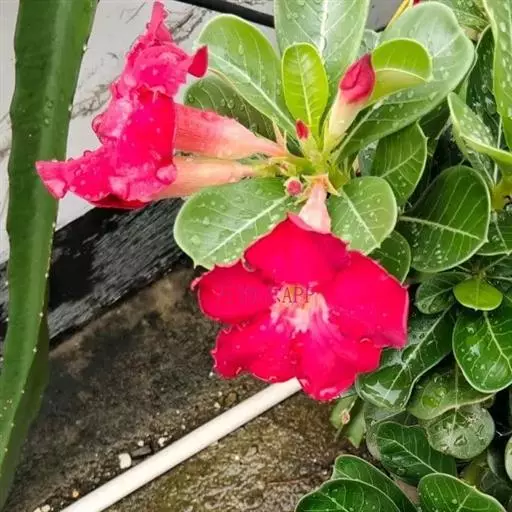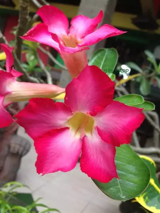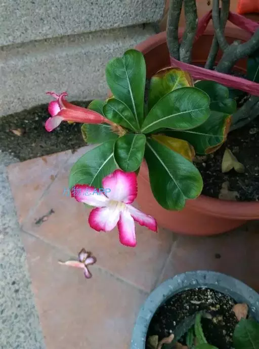 沙漠玫瑰花形似小喇叭,玫瑰红色,非常艳丽。伞形花序三五成丛,灿烂似锦,四季开花不断。因原产地接近沙漠且红如玫瑰而得名沙漠玫瑰。沙漠玫瑰单叶互生,倒卵形,顶端急尖,长8厘米~10厘米,宽2厘米~4厘米,革质,有光泽,腹面深绿色,背面灰绿色,全缘。总状花序,顶生,着花10多朵,喇叭状,长6厘米~8厘米;花冠5裂,有玫红、粉红、白色及复色等。5月~12月是沙漠玫瑰的花期,花有红、玫红、粉红、白等色。南方温室栽培较易结实。种子有白色柔毛,可助其飞行散布。