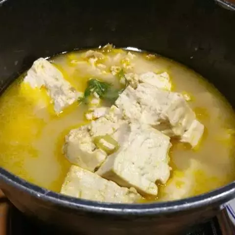 2.锅中加适量开水,放入豆腐,大火炖20-30分钟,加盐、胡椒粉、白糖调味,出锅时淋少许熟猪油、撒上葱花或青蒜叶末即可。