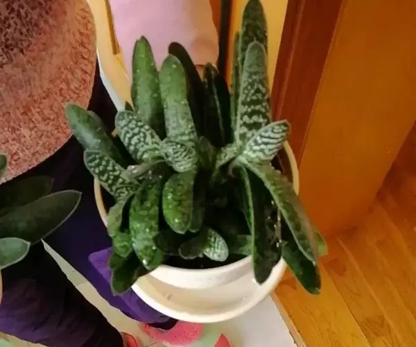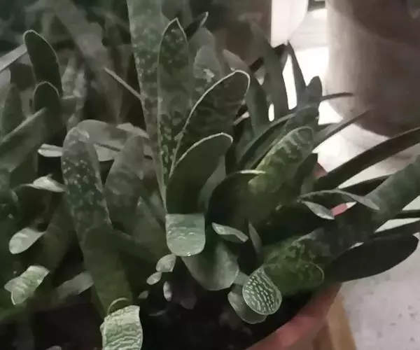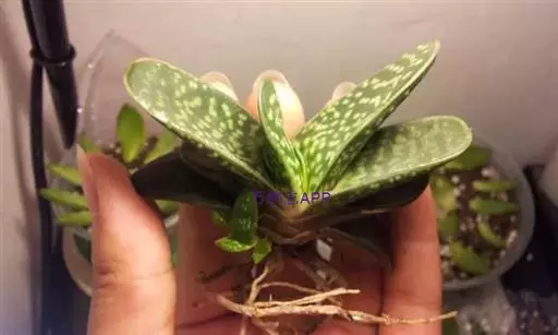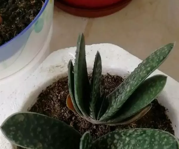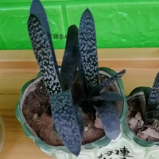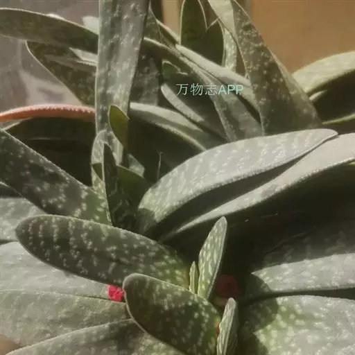 叶肉质较厚,像舌头,叶面光滑,带有白色 子宝 斑点,同种类还有锦斑变异品种,叶片中间会出现白色斑纹,是比较容易发生锦斑变异的品种。
