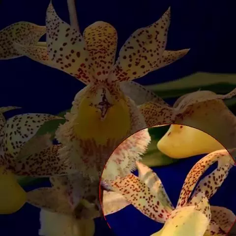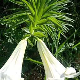花单生或2-4朵;苞片矩圆状披针形,长(4-)5-6厘米,稍宽于叶,宽1.2-1.6厘米;花梗长可达6厘米,紫色;花喇叭形,有微香,白色,里面淡黄色,背脊及近脊处淡绿黄色,长12-15厘米;外轮花被片披针形,宽1.6-2.8厘米;内轮花被片匙形,宽2.6-3.8厘米,先端钝圆,蜜腺无乳头状突起;花丝长10-12厘米,下部密被毛,花药椭圆形,长约1厘米;子房圆柱形,长2.6-4.5厘米,宽4-5毫米,淡黄色;花柱长可达10厘米,基部有毛;柱头膨大,径8毫米,3裂。花期6-7月。