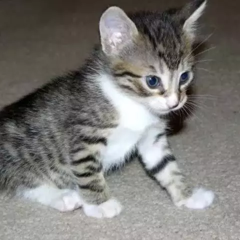 中间脸型,耳位高,耳朵大,眼间距较宽,脑门上有M型虎斑。
