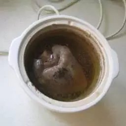 4. 牛尾和葱姜放砂锅里,水开撇去沫。炖到肉酥烂调盐味胡椒粉备用。