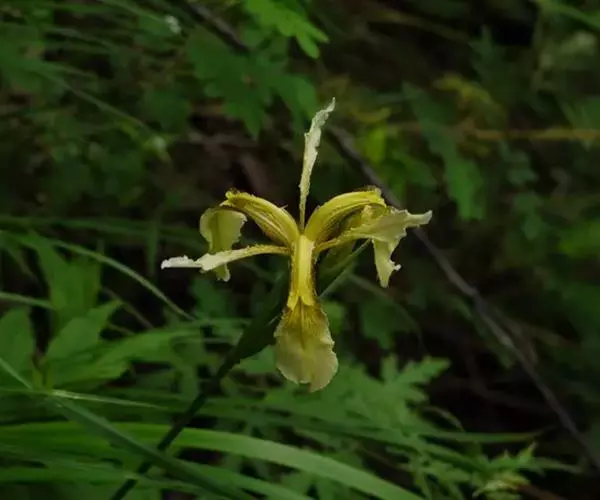 黄花鸢尾(学名:Iris wilsonii C. H. Wright):多年生草本,植株基部有老叶残留的纤维。根状茎粗壮,斜伸;须根黄白色,少分枝,有皱缩的横纹。叶基生,灰绿色,宽条形,有3-5条不明显的纵脉。花茎中空,高50-60厘米,有1-2枚茎生叶;苞片3枚,草质,绿色,披针形,内包含有2朵花;花黄色,直径6-7厘米;外花被裂片倒卵形,具紫褐色的条纹及斑点,爪部狭楔形,内花被裂片倒披针形,花盛开时向外倾斜。蒴果椭圆状柱形,6条肋明显,顶端无喙;种子棕褐色,扁平,半圆形。花期5-6月,果期7-8月。
