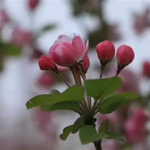 海棠花,蔷薇科苹果属植物,乔木。海棠花小枝粗壮,呈圆柱形;叶片椭圆形至长椭圆形;边缘有紧贴细锯齿,…