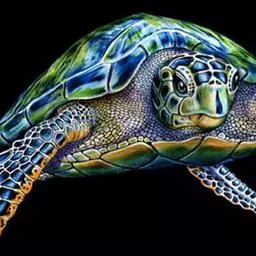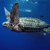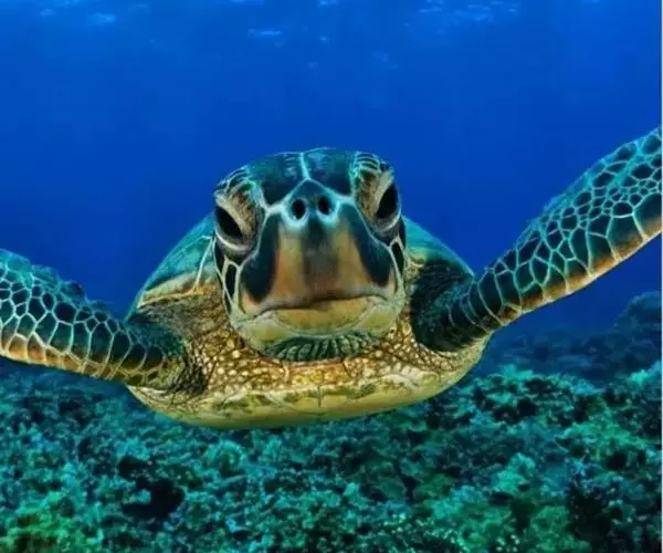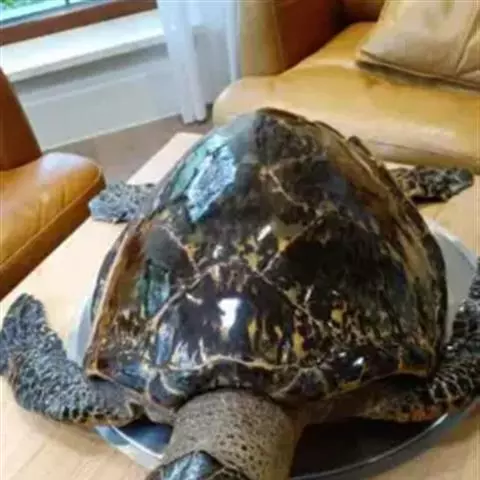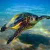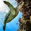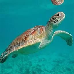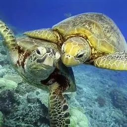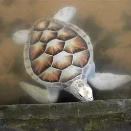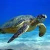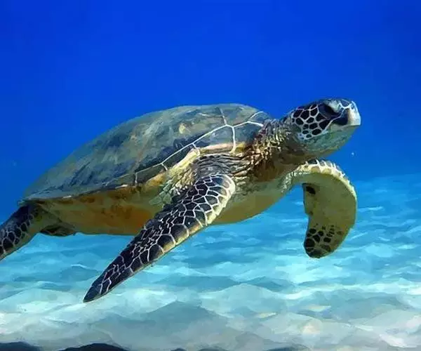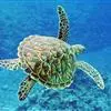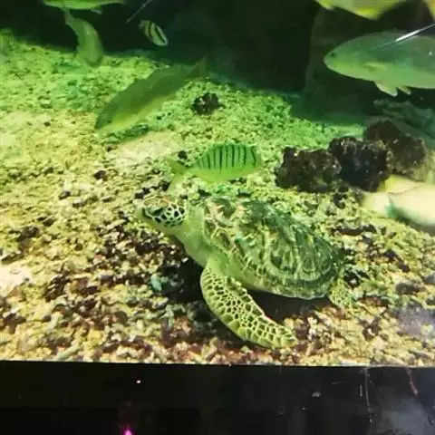海龟(学名:Chelonia mydas)是海龟科、海龟属动物。头背具对称大鳞,前额鳞一对。上颌平出,下颌略向上钩曲,颚缘有锯齿状缺刻。吻部短圆,上颚前端不成钩曲。背甲呈心形,盾片镶嵌排列;椎盾5枚;肋盾4对,第一对肋盾不与颈盾相接,缘盾每侧11片;喉盾前有单枚问喉盾;背腹甲间有一系列下缘盾。四肢桨状,前肢长于后肢,每肢内侧各具1爪。背甲橄榄色或棕色,杂有黄白色放射纹;背甲橄榄色或棕褐色,杂以浅色斑纹;雄陛尾长,达体长的二分之一,前肢的爪强大而弯曲成钩状。