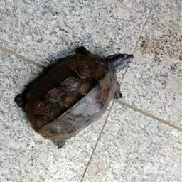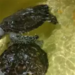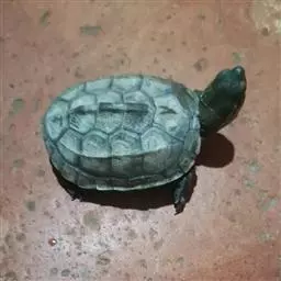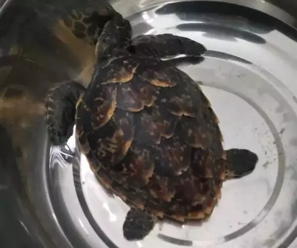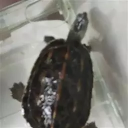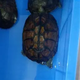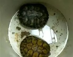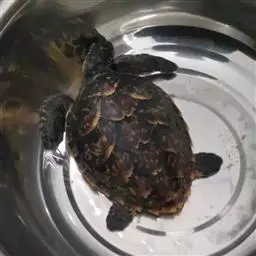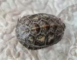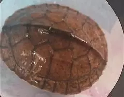 刚孵化的幼龟,背甲棕黑色,具3棱,脊棱明显,其色较浅,侧棱较弱。腹甲黄白色,两腹侧各具一条明显的纵棱;脐孔位于腹盾和股盾间缝的中央部。