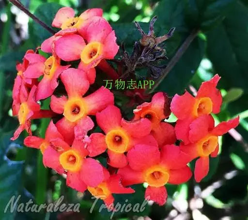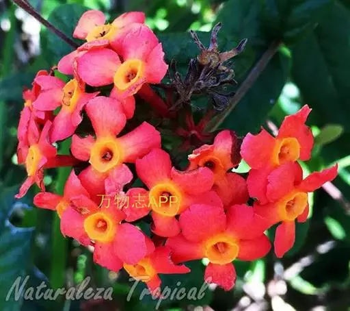 聚伞花序顶生,有花数朵至多朵,长约3厘米,宽3-4.5厘米,被棕黄色柔毛;花直径约1厘米,有花梗;萼管近球形,长约6.5毫米,密被硬毛,裂片5,线形,长4-5毫米,有疏柔毛;花冠鲜红色,喉部带黄色,外面有短柔毛,冠管柔弱,长约1厘米,裂片近圆形,长约3.5毫米,宽约4毫米;花药长约2.75毫米。蒴果球形,密被柔毛,直径3-4毫米。花期7-9月。