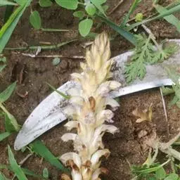 列当 二年0)15-40(-50)厘米,全株密被蛛丝状长绵毛。茎直立,不分枝, 列当 具明显的条纹,基部常稍膨大。叶干后黄褐色,生于茎下部的较密生或多年生寄生草本,株高(-1集,上部的渐变稀疏,卵状披针形,长1.5-2厘米,宽5-7毫米,连同苞片和花萼外面及边缘密被蛛丝状长绵毛。