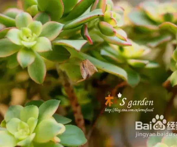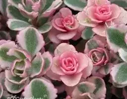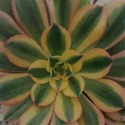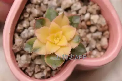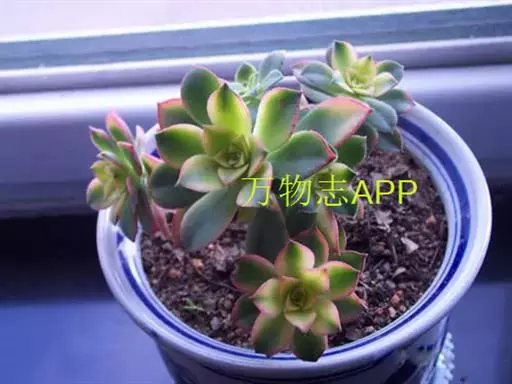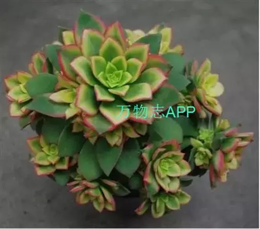 清盛锦 植株稍具分枝,叶肉质,呈莲座状排列。叶片倒卵圆形,顶端尖,正面中央稍凹,并具细绒毛,背面有龙骨状凸起,叶缘有睫毛状细锯齿,叶片色彩丰富,中央部分为杏黄色,与淡绿色间杂,外缘则呈红、红褐及粉红等色。