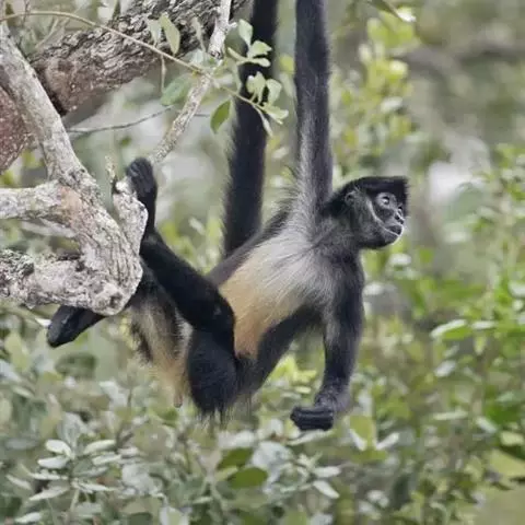 蛛猴属:共有7种。头体长约35-66厘米。头又圆又小,四肢细长,手没有拇指。…