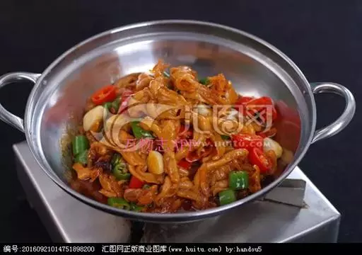 (3)锅置旺火上,放入红油烧至五成热,下蒜子、姜片炒香、放辣酱、豆瓣酱炒散,倒入焖好的肥肠和青、红椒块,加入精盐、味精,翻炒断生,淋香油,撒葱段,装入干锅内,带酒精炉上桌即可。