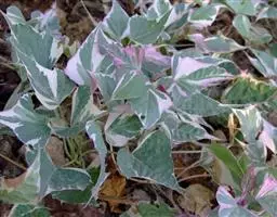 彩叶番薯地下有块根,茎蔓性,能匍匐或悬垂生长。叶不规则心 形或缺裂,叶面有紫红、乳白斑纹,甚为柔和美丽。