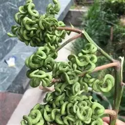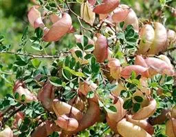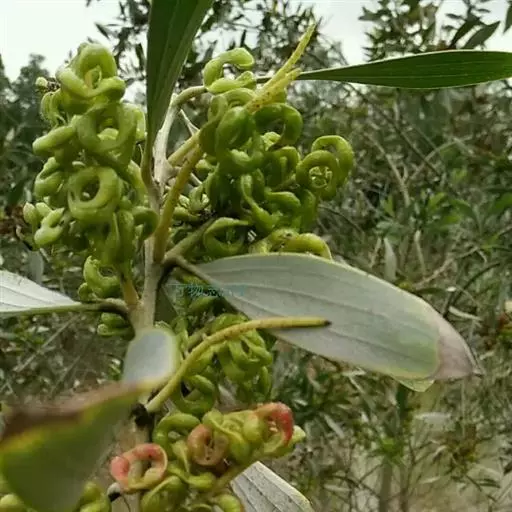 荚果初始平直,成熟时扭曲成圆环状, 荚果成熟时旋卷,长5-8厘米,宽8-12毫米,果瓣木质, 结种处略膨大。种子椭圆形,坚硬,黑色,有光泽,压扁,长约5毫米,种脐大,几乎闭合,新鲜种子具有同种脐连接的黄色脐带圈,易于分离脱落,采种后最少需要2个月贮存期来完成后熟生理过程。在澳大利亚,通常6-7月份(冬季)开花,8-10月份(冬春季节)可获得成熟种子。