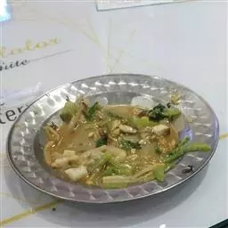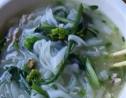 2、把米粉用10℃的水浸两小时,后放入开水锅中煮熟后,捞出放入碗内加入提前备好的汤。
