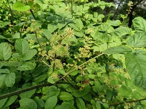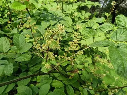 圆锥花序大,长达55厘米,顶生或腋生,分枝紧密,主轴及分枝有灰色细毛;伞形花序直径1.5-2厘米,有花多数;总花梗长1-2厘米,有毛;苞片卵形,先端尖,边缘膜质,有纤毛,长1.5-2毫米;花梗粗短,长5-6毫米,稀长达1厘米,有毛,小苞片披针形,长约1毫米,有毛;萼无毛,长1.5毫米,边缘有5个三角形尖齿;花瓣5,三角状卵形,长2毫米;雄蕊5,长2.5毫米;子房5室;花柱5,基部合生,顶端离生。果实紫黑色,有5稜,直径约3毫米;宿存花柱长约2毫米,中部以下合生,顶端离生,反曲。花期7-8月,果期8-9月。