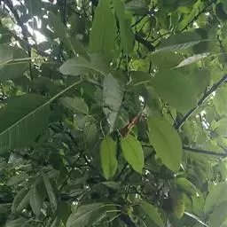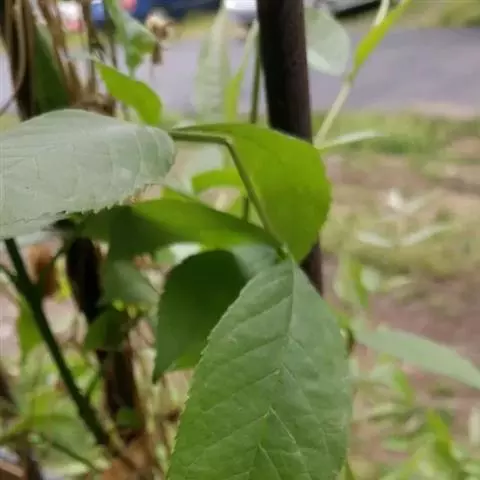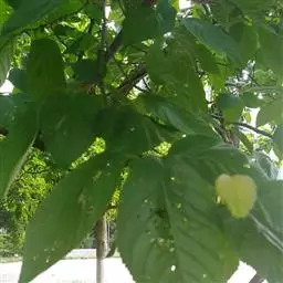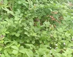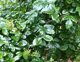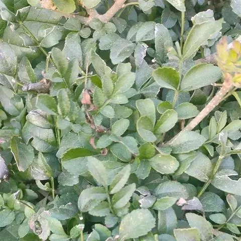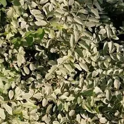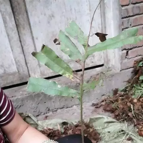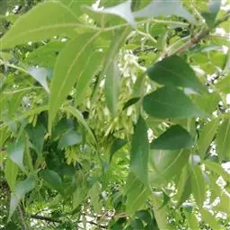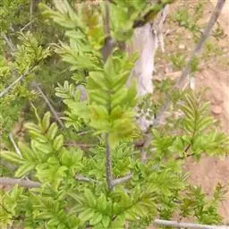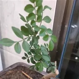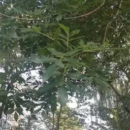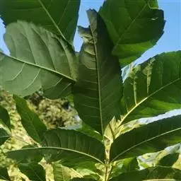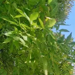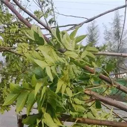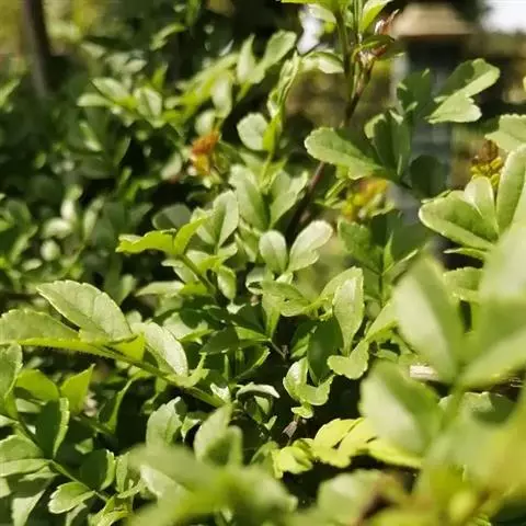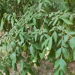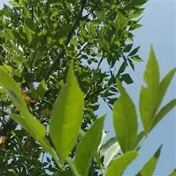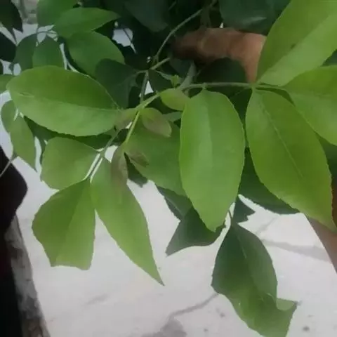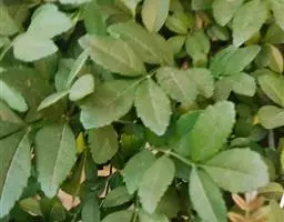 叶:羽状复叶长18-44厘米;叶柄长2-5厘米,基部几不膨大;叶轴圆柱形,上面具较宽的浅沟,密被灰黄色柔毛(变种和一些栽培型常无毛);小叶79枚,薄革质,长圆状披针形、狭卵形或椭圆形,长4-13厘米,宽2-8厘米,顶生小叶与侧生小叶几等大,先端渐尖或急尖,基部阔楔形,叶缘具不明显钝锯齿或近全缘,上面黄绿色,无毛,下面淡绿色,疏被绢毛,脉上较密,中脉在上面凹入,侧脉7-9对,与细脉在下面凸起;小叶无柄或下方1对小叶具短柄。