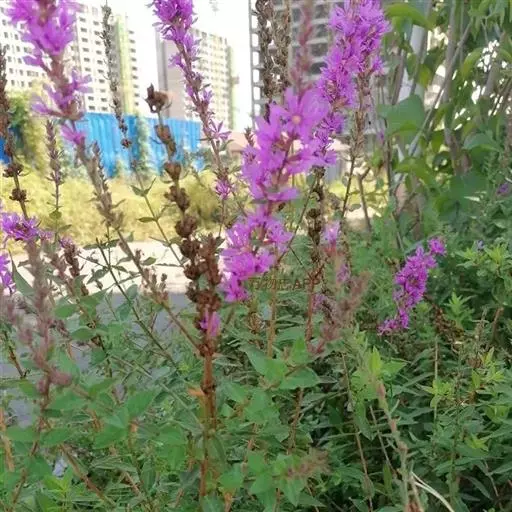 千屈菜,拉丁学名:Lythrum salicaria L.千屈菜科、千屈菜属多年生草本,根茎横卧于地下,粗壮;茎直立,多分枝,全株青绿色,略被粗毛或密被绒毛,枝通常具4棱。叶对生或三叶轮生,披针形或阔披针形,顶端钝形或短尖,基部圆形或心形,有时略抱茎,全缘,无柄。花组成小聚伞花序,簇生,因花梗及总梗极短,因此花枝全形似一大型穗状花序;苞片阔披针形至三角状卵形,三角形;附属体针状,直立,红紫色或淡紫色,倒披针状长椭圆形,基部楔形,着生于萼筒上部,有短爪,稍皱缩;伸出萼筒之外;子房2室,花柱长短不一。蒴果扁圆形。