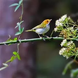 棕脸鹟莺:体长10厘米,是一种色彩亮丽而有特色的莺鸟。头栗色,具黑色侧冠纹。上体绿,腰黄色。下体白,…