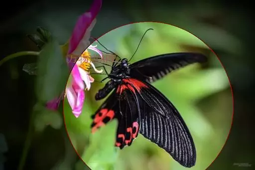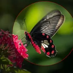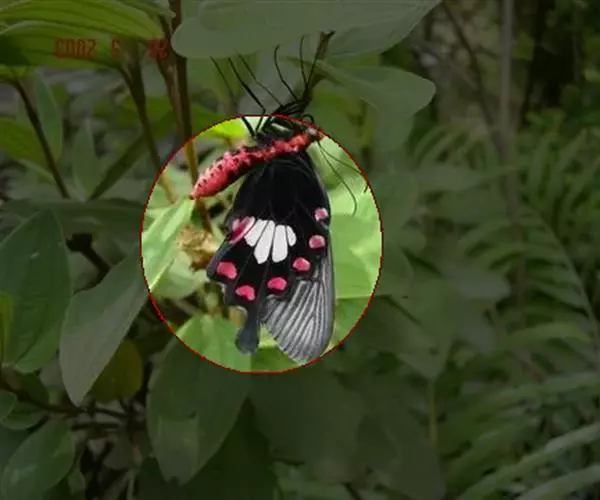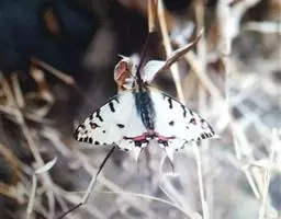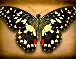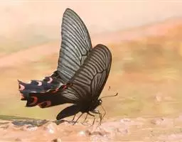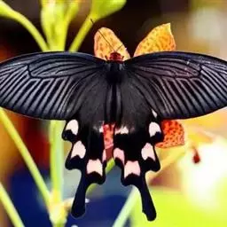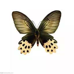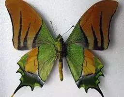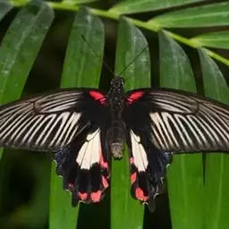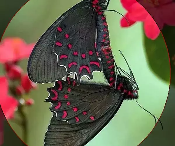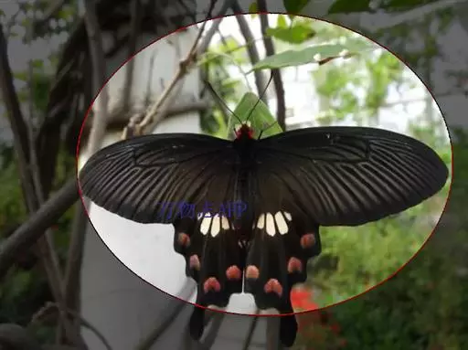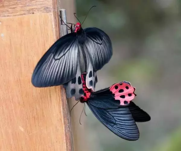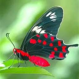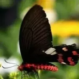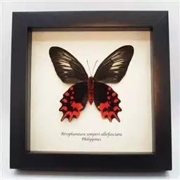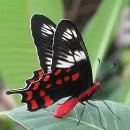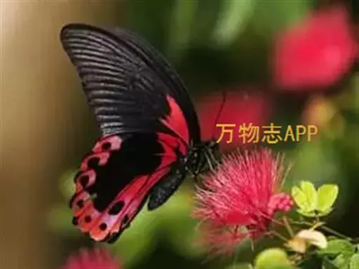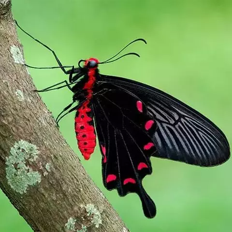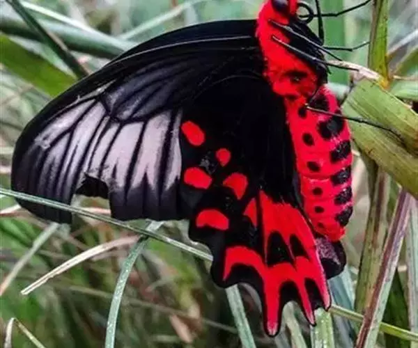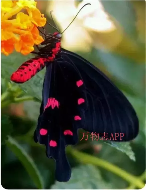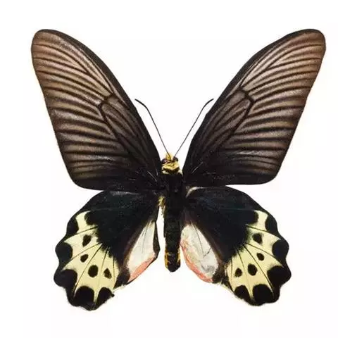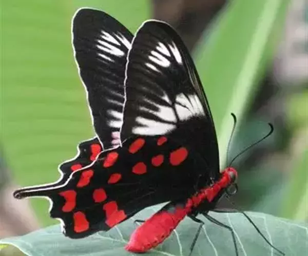 成虫:翅展100—130 mm。 体背黑色,头、颈、胸侧及腹侧具红色鳞毛。雌、雄异型。雄蝶翅黑绒色,后翅的臀缘褶很大,反卷且具灰白色体毛的性标;反面端半部红色,内镶嵌7个黑斑。雌蝶前翅大部及后翅色淡,后翅端半部灰黄色内镶8个黑斑,其中m1室外缘1个不十分清楚;后翅反面端半部浅红色,只镶嵌7个黑斑,因m1室有1个与基半部的黑色相并。