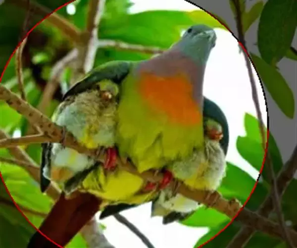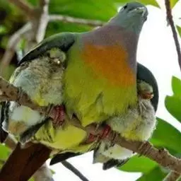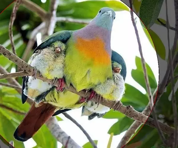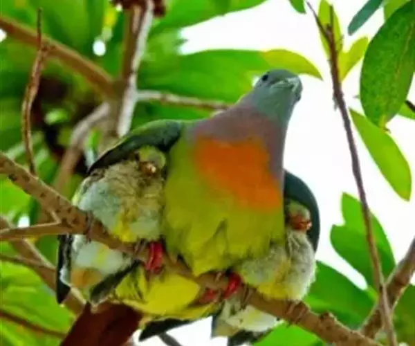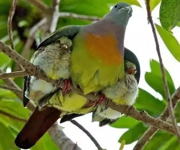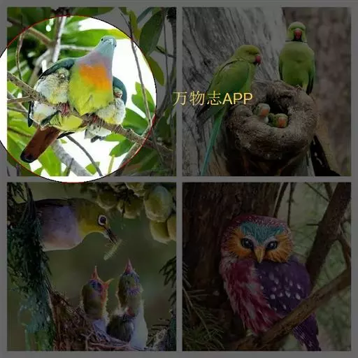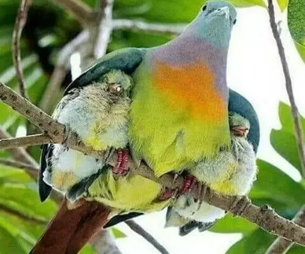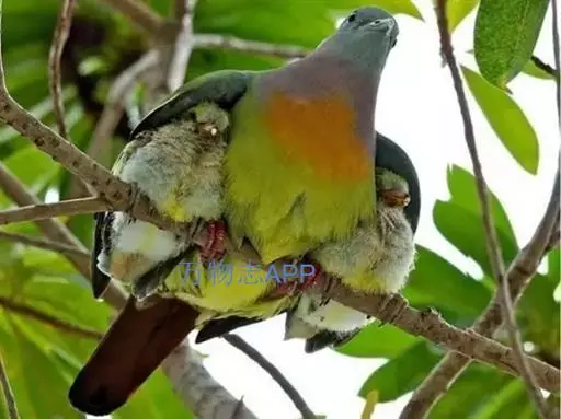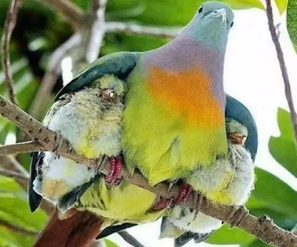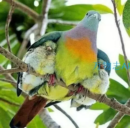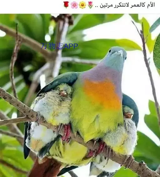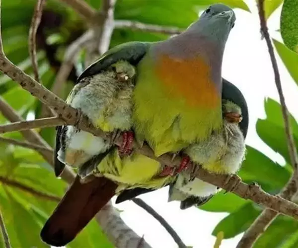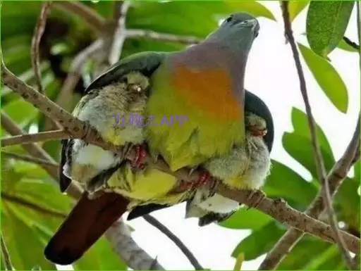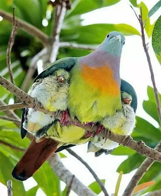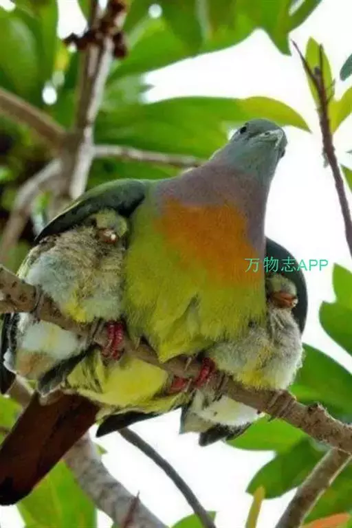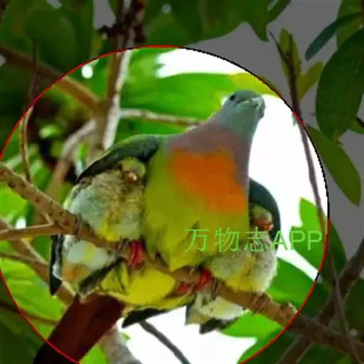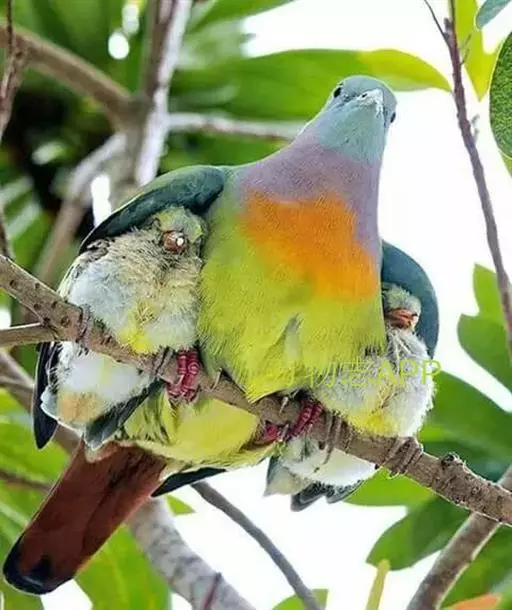 雌鸟上体的绿色部分较雄鸟晦暗,没有栗色而代之以暗绿色,头顶和胸部为淡黄绿色而没有橙色,其余部分与雄鸟相似。