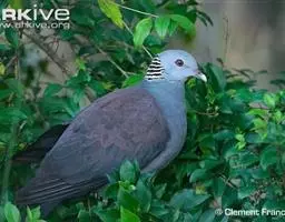 楔尾绿鸠(学名:Treron sphenura)体长30-35厘米,体重约300-400克。头部和颈部为淡黄绿色,并染有橙棕色。颈后部为绿色,背上部转为灰色。背下部至尾上覆羽为橄榄绿色。飞羽和覆羽呈褐黑色,中央尾羽与腰部同色,外侧尾羽呈灰色。颏部及喉部为黄色,胸下部至腹部呈淡绿黄色,下腹部为淡黄色,两胁呈蓝灰色。