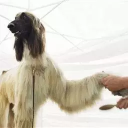 阿富汗猎犬全身披丝绢状的长毛,毛色鲜艳,呈多种颜色,背中线附近毛短,…
