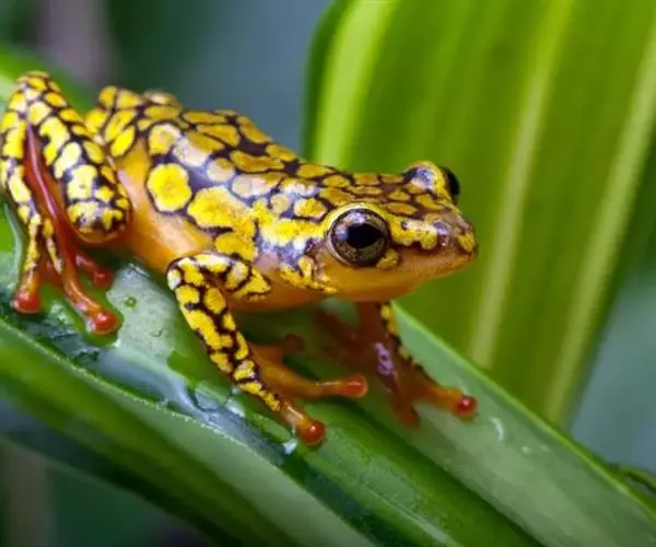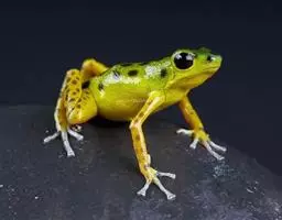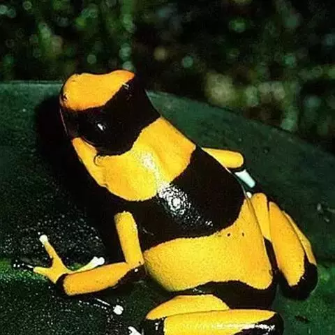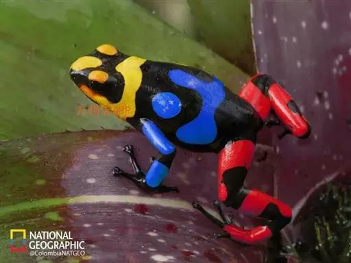 箭毒蛙主要分布于巴西、圭亚那、哥伦比亚和中美洲的热带雨林中,通身鲜明多彩,常为黑与艳红、黄、橙、粉红、绿、蓝的结合,四肢布满鳞纹。其中以柠檬黄最为耀眼和突出。