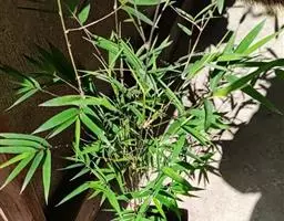 凤尾竹 Raeusch. ex Schult. ’Fernleaf’ R. A. Young)是禾本科,簕竹属孝顺竹的变种。植株较高大,杆高可达6米,竿中空,小枝稍下弯,下部挺直,绿色;竿壁稍薄;节处稍隆起,无毛;叶鞘无毛,纵肋稍隆起,背部具脊;叶耳肾形,边缘具波曲状细长繸毛;叶舌圆拱形,叶片线形,上表面无毛,下表面粉绿而密被短柔毛,小穗含小花,中间小花为两性;外稃两侧稍不对称,长圆状披针形,先端急尖;内稃线形,脊上被短纤毛,花药紫色,子房卵球形,羽毛状。成熟颖果未见。原产中国,华东、华南、西南以至台湾、香港均有栽培。凤尾竹喜温暖、湿润和阳光充足的环境,耐寒。宜土层深厚、肥沃、疏松的微酸性壤土。该种观赏价值较高,宜作庭院丛栽,也可作盆景植物。全草或根入药,味淡、微苦,性寒,有清热利湿、凉血止血、消肿解毒功效,可治痢疾、泄泻等多种病症。凤尾