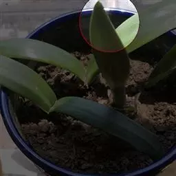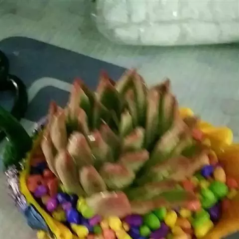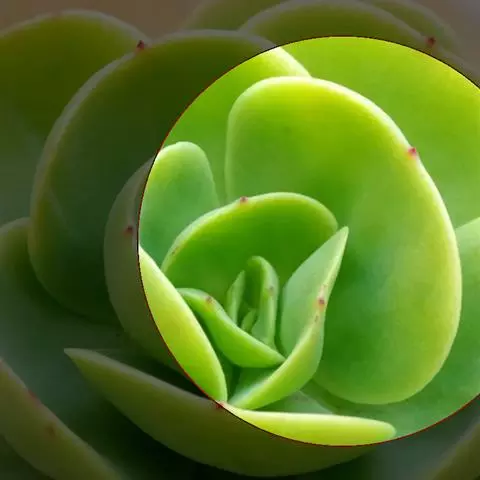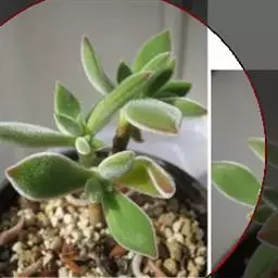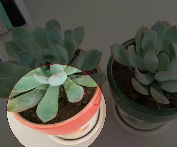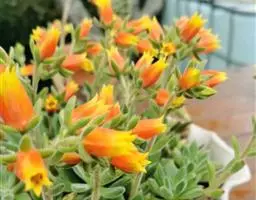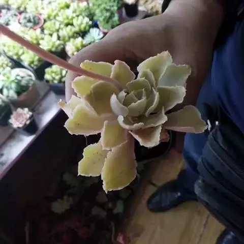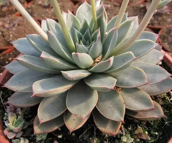 花月夜 拥有25片或更多的叶片,围合呈莲座状,所以看不出明显的主茎。叶色为淡蓝绿色,叶面上表面平整或略凹,下表面圆形微凸,叶缘有红色细边,叶尖小且为红色。通常呈现单株的状态,因为形成群生需要的周期很长。花期在冬天至来年的春天,弯弯的花箭上开满黄色小花 。