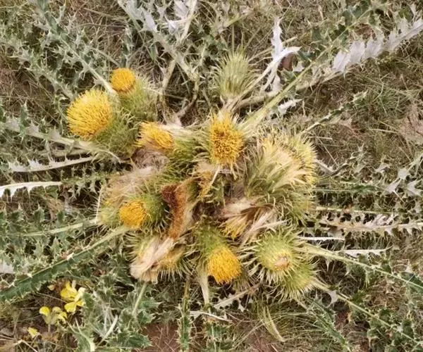 头状花序多数,达20个,密集成团球状,花序梗粗壮,长5-6厘米,有1-2个线形或线状披针形的苞叶。总苞宽钟状,宽达6厘米。总苞片8-9层,最外层披针形,长2-2.5厘米,坚硬,革质,顶端渐尖成芒刺;中内层披针形或长披针形,坚硬,革质,长3-3.5厘米;最内层线形或宽线形,硬膜质。