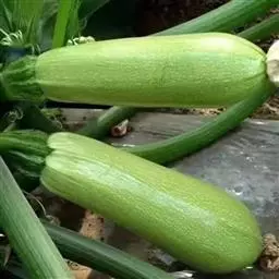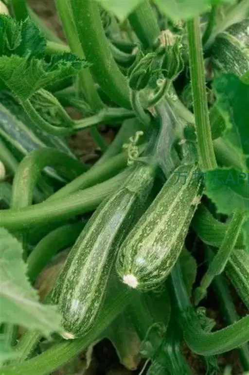 长蔓西葫芦 植株蔓长3米,粗2.2厘米。叶心脏形,深绿色,叶缘有不规则锯齿。第一雌花着生于主蔓第四至六节。瓜长椭圆形,表皮光滑,绿白色,有棱6条。一般单瓜重2-3千克。