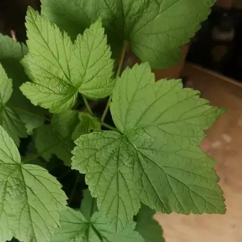 叶宽卵圆形,长1.5-4厘米,宽1.5-5厘米,不育枝上的叶较大,基部截形至心脏形,幼时两面被短柔毛,老时渐脱落,下面沿叶脉有时具少数腺毛,掌状3-5深裂,裂片先端稍钝或急尖,边缘有粗钝锯齿;叶柄长1.5-3厘米,具柔毛,老时脱落近无毛,常有稀疏腺毛。