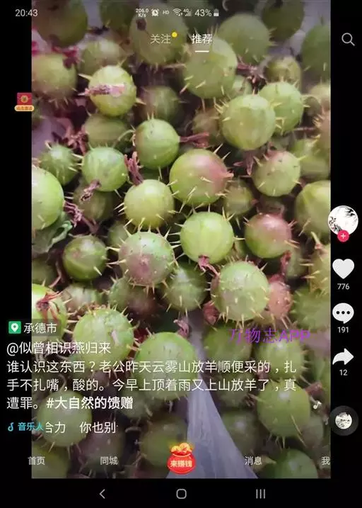 果实圆球形,直径约1厘米,未熟时浅绿色至浅黄绿色,熟后转变为暗红黑色,具多数黄褐色小刺。花期5-6月,果期7-8月。
