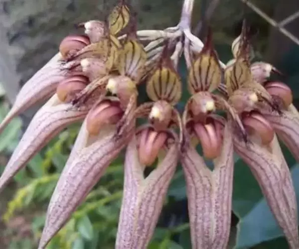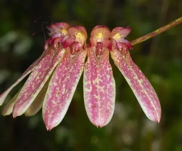 花葶黄绿色带紫红色条斑,从假鳞茎基部抽出,直立,通常长约17厘米,伞形花序具数朵花;花序柄纤细,粗1-2毫米,具长5-10毫米的筒状鞘;花苞片淡黄色带紫色斑点,披针形,长约5毫米,先端急尖;花梗和子房纤细,长约1厘米;花浅白色密布紫红色斑点;中萼片卵状长圆形,凹的,长约5毫米,中部宽约3毫米,具5条带紫红色小斑点的脉,边缘紫红色,近先端处具齿,先端具1条长约3毫米的芒,芒的表面稍粗糙或被细乳突;侧萼片长圆形,比中萼片长3-4倍,基部贴生在蕊柱足上,先端稍钝,基部上方扭转而上下侧边缘除基部和先端外分别彼此粘合,全缘,具5条脉。